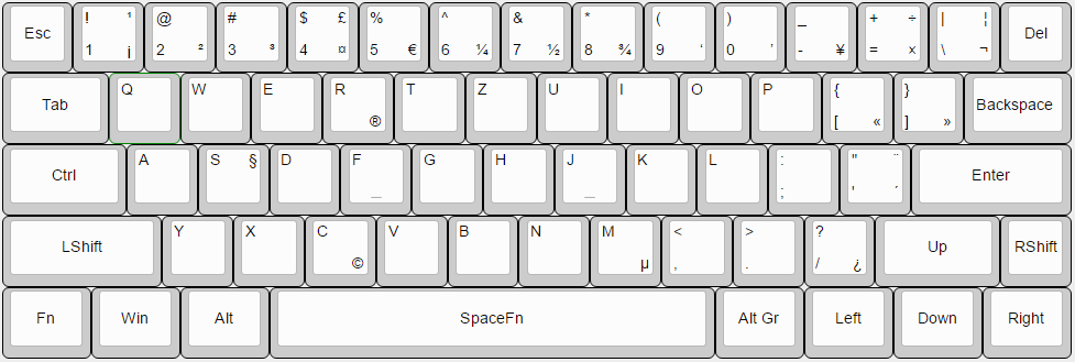 This is the function layer for German diacritics. It can be accessed via the Fn or by holding Space on the base layer.